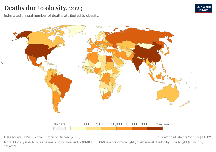 IHME, Global Burden of Disease (2024) – with minor processing by Our World in Data. “Deaths due to obesity” [dataset]. IHME, Global Burden of Disease, “Global Burden of Disease - Risk Factors” [original data]. Retrieved February 9, 2026 from https://data-lexicalindex-indicators.owid.pages.dev:8789/20250909-093708/grapher/deaths-due-to-obesity.html (archived on September 9, 2025).
