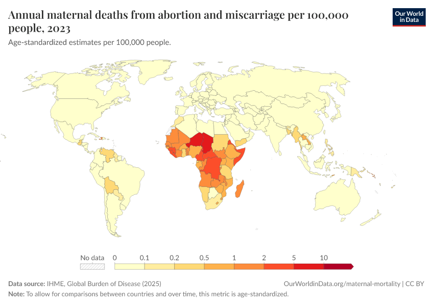 IHME, Global Burden of Disease (2024) – with minor processing by Our World in Data. “Annual maternal deaths from abortion and miscarriage per 100,000 people” [dataset]. IHME, Global Burden of Disease, “Global Burden of Disease - Deaths and DALYs” [original data]. Retrieved February 9, 2026 from https://data-lexicalindex-indicators.owid.pages.dev:8789/20260108-164518/grapher/deaths-from-abortion-and-miscarriage-per-100000-people.html (archived on January 8, 2026).