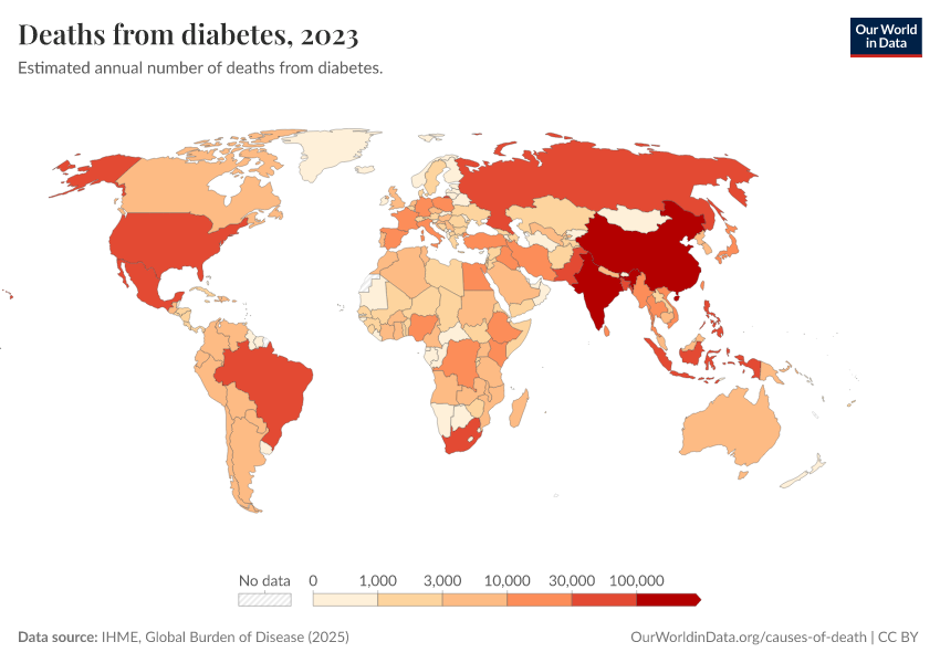 IHME, Global Burden of Disease (2024) – with minor processing by Our World in Data. “Deaths from diabetes” [dataset]. IHME, Global Burden of Disease, “Global Burden of Disease - Deaths and DALYs” [original data]. Retrieved February 9, 2026 from https://data-lexicalindex-indicators.owid.pages.dev:8789/20250909-093708/grapher/deaths-from-diabetes.html (archived on September 9, 2025).
