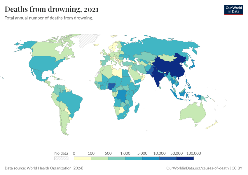 World Health Organization (2024) – with major processing by Our World in Data. “Deaths from drowning” [dataset]. World Health Organization, “Global Health Estimates” [original data]. Retrieved February 9, 2026 from https://data-lexicalindex-indicators.owid.pages.dev:8789/20250909-093708/grapher/deaths-from-drowning-ghe.html (archived on September 9, 2025).