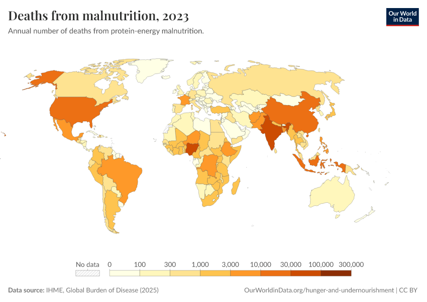 IHME, Global Burden of Disease (2024) – with minor processing by Our World in Data. “Deaths from malnutrition” [dataset]. IHME, Global Burden of Disease, “Global Burden of Disease - Deaths and DALYs” [original data]. Retrieved February 9, 2026 from https://data-lexicalindex-indicators.owid.pages.dev:8789/20250909-093708/grapher/deaths-from-malnutrition.html (archived on September 9, 2025).