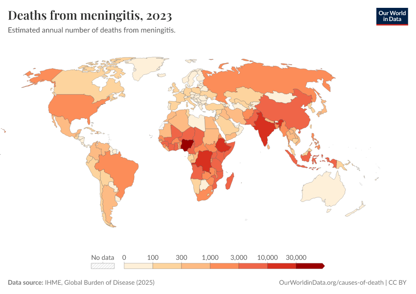 IHME, Global Burden of Disease (2024) – with minor processing by Our World in Data. “Deaths from meningitis” [dataset]. IHME, Global Burden of Disease, “Global Burden of Disease - Deaths and DALYs” [original data]. Retrieved February 9, 2026 from https://data-lexicalindex-indicators.owid.pages.dev:8789/20250909-093708/grapher/deaths-from-meningitis.html (archived on September 9, 2025).