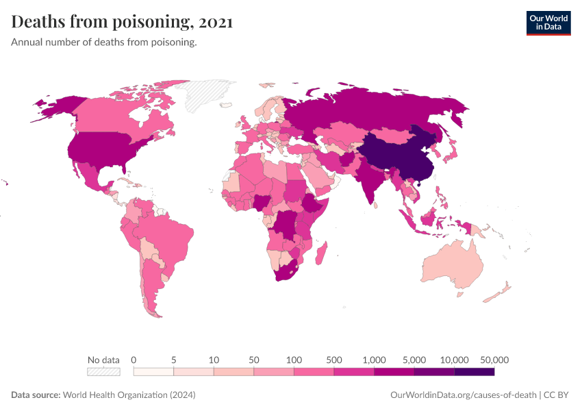 World Health Organization (2024) – with major processing by Our World in Data. “Deaths from poisoning” [dataset]. World Health Organization, “Global Health Estimates” [original data]. Retrieved February 9, 2026 from https://data-lexicalindex-indicators.owid.pages.dev:8789/20250909-093708/grapher/deaths-from-poisonings-ghe.html (archived on September 9, 2025).