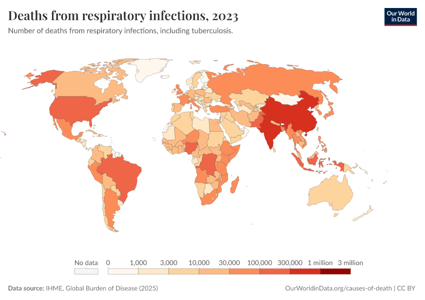 IHME, Global Burden of Disease (2024) – with minor processing by Our World in Data. “Deaths from respiratory infections” [dataset]. IHME, Global Burden of Disease, “Global Burden of Disease - Deaths and DALYs” [original data]. Retrieved February 9, 2026 from https://data-lexicalindex-indicators.owid.pages.dev:8789/20250909-093708/grapher/deaths-from-respiratory-infections.html (archived on September 9, 2025).