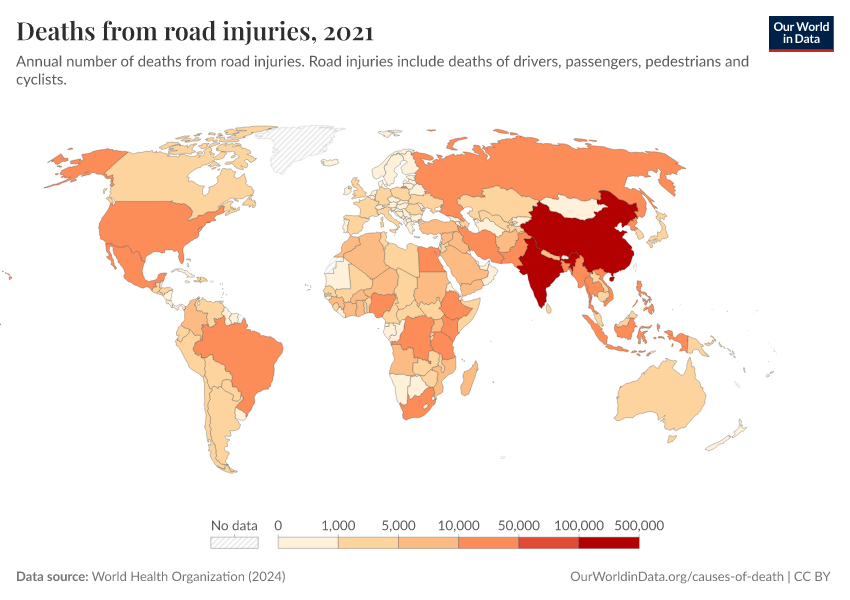 World Health Organization (2024) – with major processing by Our World in Data. “Deaths from road injuries” [dataset]. World Health Organization, “Global Health Estimates” [original data]. Retrieved February 9, 2026 from https://data-lexicalindex-indicators.owid.pages.dev:8789/20250909-093708/grapher/deaths-from-road-injuries.html (archived on September 9, 2025).