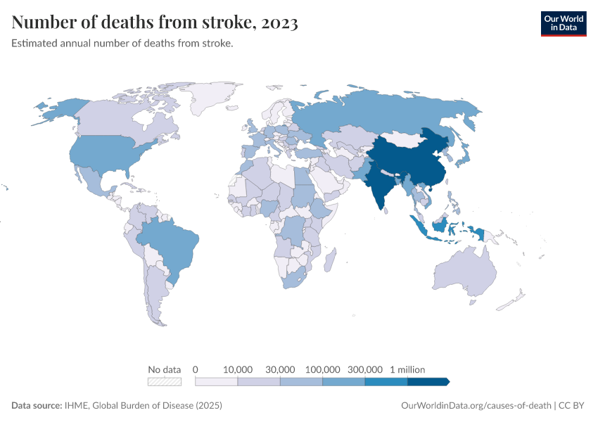 IHME, Global Burden of Disease (2024) – with minor processing by Our World in Data. “Number of deaths from stroke” [dataset]. IHME, Global Burden of Disease, “Global Burden of Disease - Deaths and DALYs” [original data]. Retrieved February 9, 2026 from https://data-lexicalindex-indicators.owid.pages.dev:8789/20250909-093708/grapher/deaths-from-strokes.html (archived on September 9, 2025).