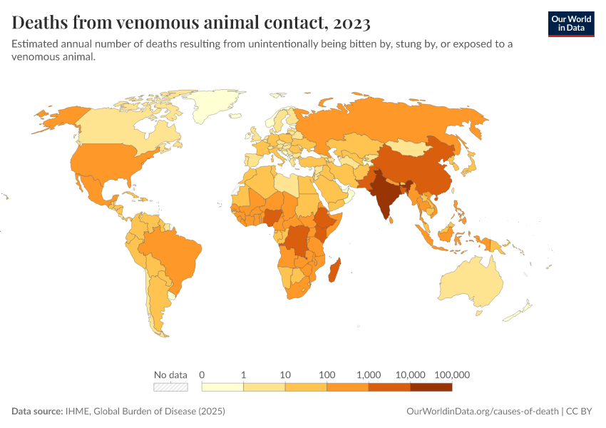 IHME, Global Burden of Disease (2024) – with minor processing by Our World in Data. “Deaths from venomous animal contact” [dataset]. IHME, Global Burden of Disease, “Global Burden of Disease - Deaths and DALYs” [original data]. Retrieved February 9, 2026 from https://data-lexicalindex-indicators.owid.pages.dev:8789/20250909-093708/grapher/deaths-from-venomous-animal-contact.html (archived on September 9, 2025).