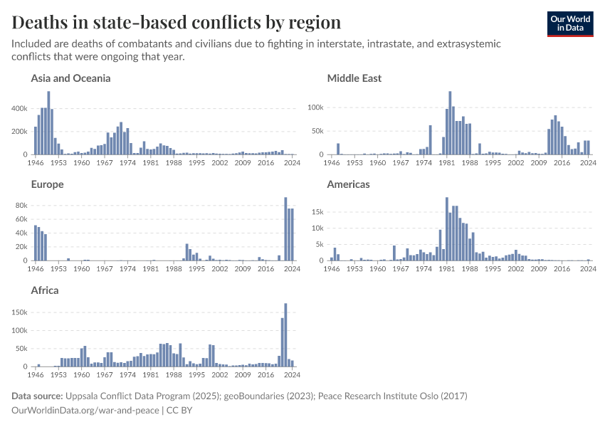 “Data Page: Deaths in state-based conflicts by region”, part of the following publication: Bastian Herre, Lucas Rodés-Guirao, and Max Roser (2024) - “War and Peace”. Data adapted from Uppsala Conflict Data Program, geoBoundaries, Peace Research Institute Oslo. Retrieved from https://data-lexicalindex-indicators.owid.pages.dev:8789/20260119-070102/grapher/deaths-in-state-based-conflicts-by-region.html [online resource] (archived on January 19, 2026).