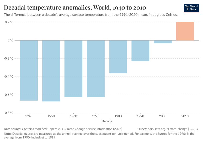 Contains modified Copernicus Climate Change Service information (2025) – with major processing by Our World in Data. “Decadal temperature anomalies” [dataset]. Contains modified Copernicus Climate Change Service information, “ERA5 monthly averaged data on single levels from 1940 to present 2” [original data]. Retrieved February 9, 2026 from https://data-lexicalindex-indicators.owid.pages.dev:8789/20260106-144105/grapher/decadal-temperature-anomaly.html (archived on January 6, 2026).