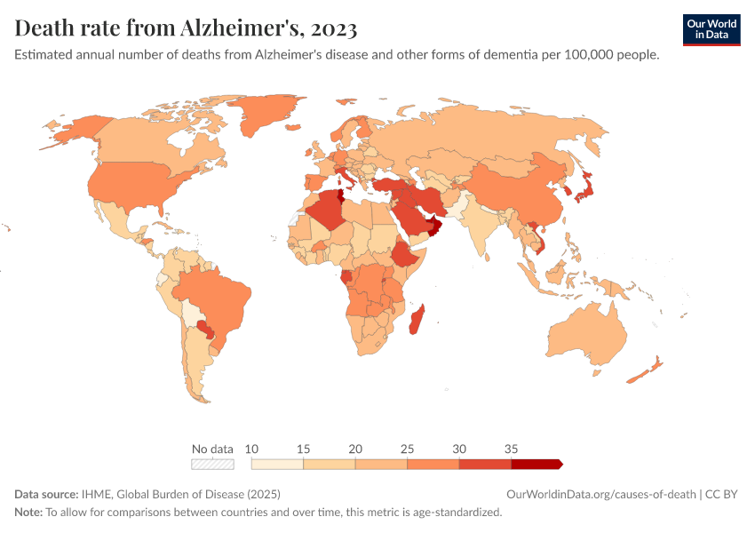 IHME, Global Burden of Disease (2024) – with minor processing by Our World in Data. “Death rate from Alzheimer's” [dataset]. IHME, Global Burden of Disease, “Global Burden of Disease - Deaths and DALYs” [original data]. Retrieved February 9, 2026 from https://data-lexicalindex-indicators.owid.pages.dev:8789/20250909-093708/grapher/dementia-death-rates.html (archived on September 9, 2025).
