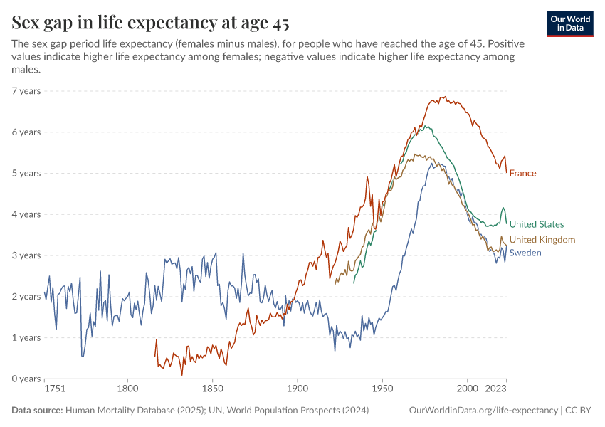 “Data Page: Life expectancy at 45”, part of the following publication: Saloni Dattani, Lucas Rodés-Guirao, Hannah Ritchie, Esteban Ortiz-Ospina, and Max Roser (2023) - “Life Expectancy”. Data adapted from Human Mortality Database, United Nations. Retrieved from https://data-lexicalindex-indicators.owid.pages.dev:8789/20251022-222946/grapher/difference-in-female-and-male-life-expectancy-at-age-45.html [online resource] (archived on October 22, 2025).How to cite this data