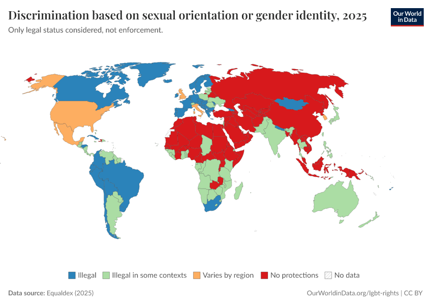 Equaldex (2025) – with major processing by Our World in Data. “Discrimination based on sexual orientation or gender identity” [dataset]. Equaldex, “Equaldex” [original data]. Retrieved February 9, 2026 from https://data-lexicalindex-indicators.owid.pages.dev:8789/20250909-093708/grapher/discrimination-lgbt-equaldex.html (archived on September 9, 2025).