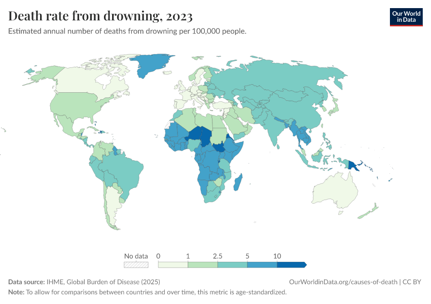 IHME, Global Burden of Disease (2024) – with minor processing by Our World in Data. “Death rate from drowning” [dataset]. IHME, Global Burden of Disease, “Global Burden of Disease - Deaths and DALYs” [original data]. Retrieved February 9, 2026 from https://data-lexicalindex-indicators.owid.pages.dev:8789/20250909-093708/grapher/drowning-death-rates.html (archived on September 9, 2025).