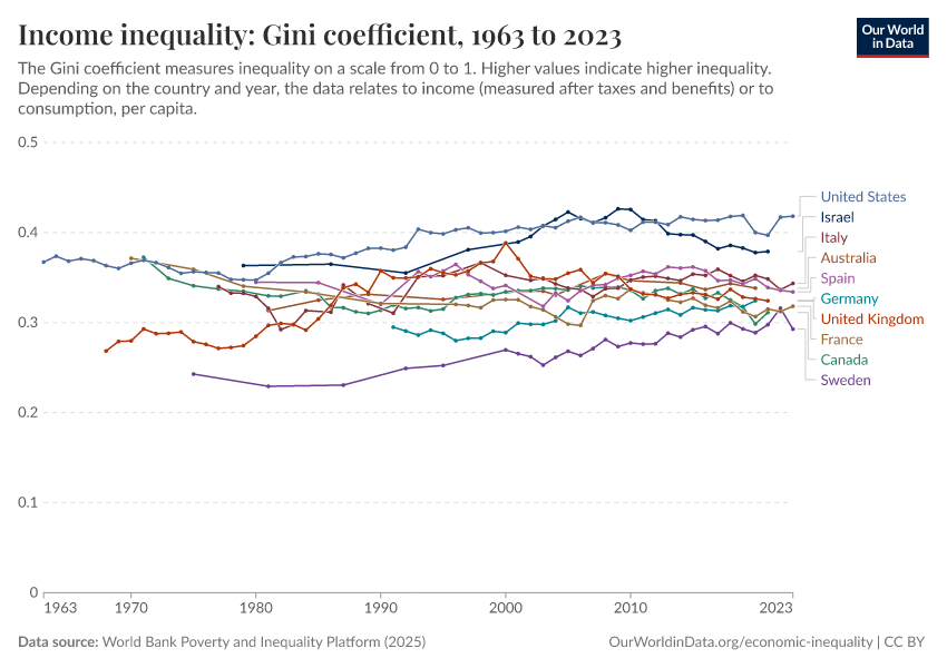 World Bank Poverty and Inequality Platform (2025) – with major processing by Our World in Data. “Income inequality: Gini coefficient – World Bank” [dataset]. World Bank Poverty and Inequality Platform, “World Bank Poverty and Inequality Platform (PIP) 20250930_2021, 20250930_2017” [original data]. Retrieved February 9, 2026 from https://data-lexicalindex-indicators.owid.pages.dev:8789/20260127-114142/grapher/economic-inequality-gini-index.html (archived on January 27, 2026).