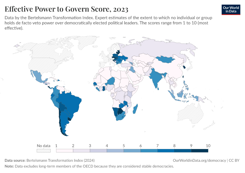 “Data Page: Effective Power to Govern Score”, part of the following publication: Bastian Herre, Lucas Rodés-Guirao, and Esteban Ortiz-Ospina (2013) - “Democracy”. Data adapted from Bertelsmann Transformation Index. Retrieved from https://data-lexicalindex-indicators.owid.pages.dev:8789/20260204-170225/grapher/effective-power-to-govern-score-bti.html [online resource] (archived on February 4, 2026).How to cite this data