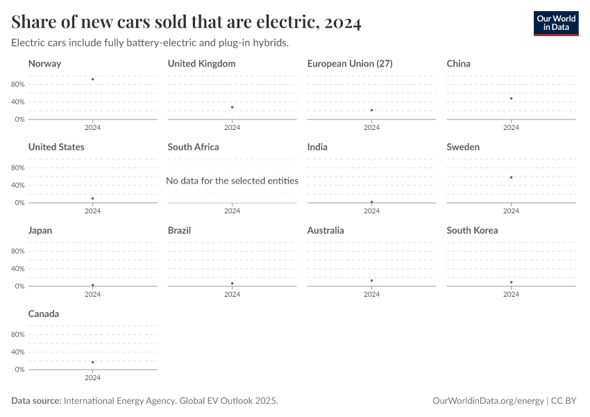 “Data Page: Share of new cars sold that are electric”. Our World in Data (2026). Data adapted from International Energy Agency. Global EV Outlook 2025.. Retrieved from https://data-lexicalindex-indicators.owid.pages.dev:8789/20250909-093708/grapher/electric-car-sales-share.html [online resource] (archived on September 9, 2025).