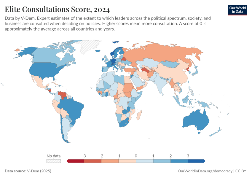 “Data Page: Elite consultation”, part of the following publication: Bastian Herre, Lucas Rodés-Guirao, and Esteban Ortiz-Ospina (2013) - “Democracy”. Data adapted from V-Dem. Retrieved from https://data-lexicalindex-indicators.owid.pages.dev:8789/20260204-170225/grapher/elite-consultations-score.html [online resource] (archived on February 4, 2026).How to cite this data