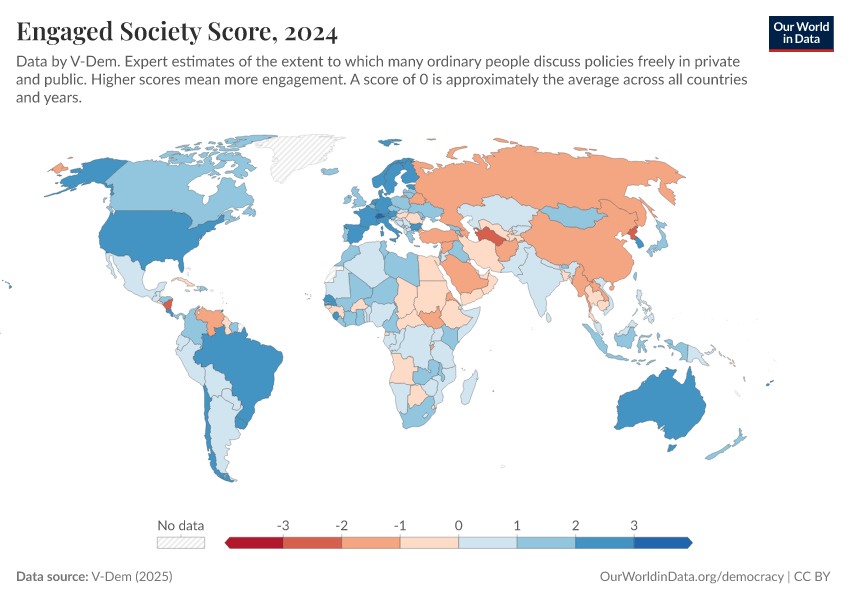 “Data Page: Engaged society”, part of the following publication: Bastian Herre, Lucas Rodés-Guirao, and Esteban Ortiz-Ospina (2013) - “Democracy”. Data adapted from V-Dem. Retrieved from https://data-lexicalindex-indicators.owid.pages.dev:8789/20260204-170225/grapher/engaged-society-score.html [online resource] (archived on February 4, 2026).How to cite this data