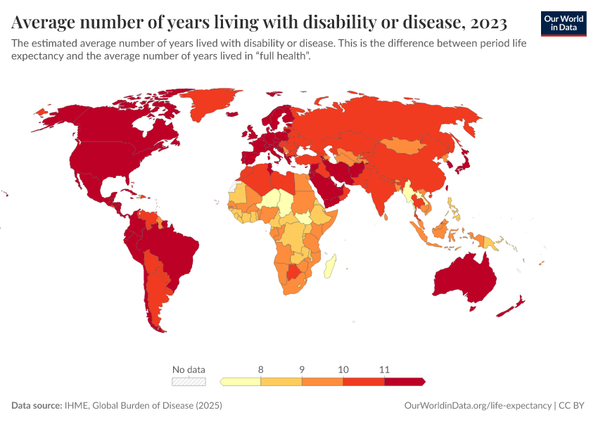 “Data Page: Average number of years living with disability or disease”, part of the following publication: Saloni Dattani, Lucas Rodés-Guirao, Hannah Ritchie, Esteban Ortiz-Ospina, and Max Roser (2023) - “Life Expectancy”. Data adapted from IHME, Global Burden of Disease. Retrieved from https://data-lexicalindex-indicators.owid.pages.dev:8789/20250909-093708/grapher/expected-years-of-living-with-disability-or-disease-burden.html [online resource] (archived on September 9, 2025).How to cite this data
