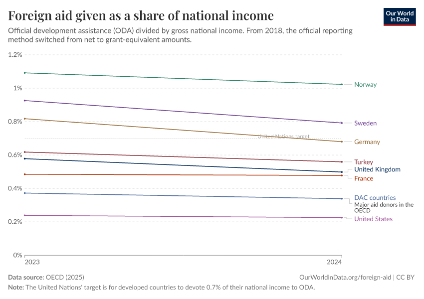 OECD (2025) – with minor processing by Our World in Data. “Foreign aid given as a share of national income – Official estimate” [dataset]. OECD, “OECD Official Development Assistance (ODA) - DAC1: Flows by provider (ODA+OOF+Private)” [original data]. Retrieved February 9, 2026 from https://data-lexicalindex-indicators.owid.pages.dev:8789/20251230-141326/grapher/foreign-aid-given-as-a-share-of-national-income.html (archived on December 30, 2025).