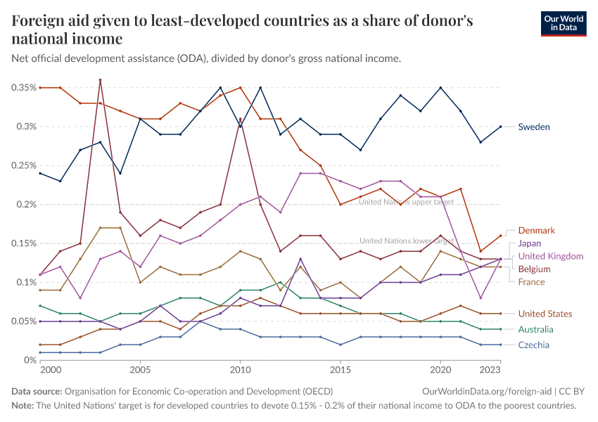“Data Page: Foreign aid given to least-developed countries as a share of donor's national income”. Our World in Data (2026). Data adapted from Organisation for Economic Co-operation and Development. Retrieved from https://data-lexicalindex-indicators.owid.pages.dev:8789/20251120-211038/grapher/foreign-aid-given-to-least-developed-countries-as-a-share-of-donors-national-income.html [online resource] (archived on November 20, 2025).