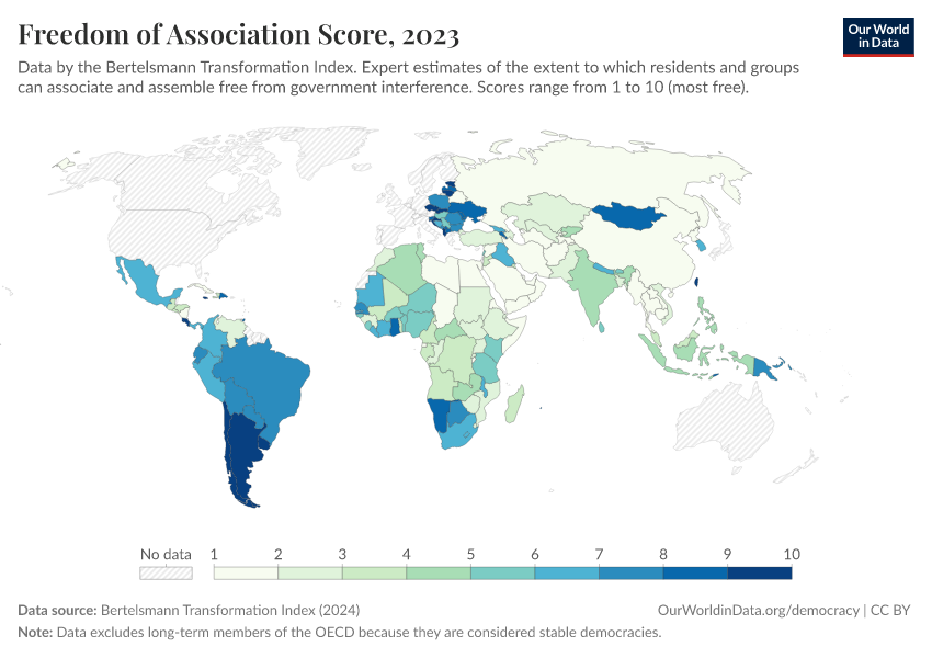 Bertelsmann Transformation Index (2024) – processed by Our World in Data. “Freedom of Association Score” [dataset]. Bertelsmann Transformation Index, “Bertelsmann Transformation Index, Scores” [original data]. Retrieved February 9, 2026 from https://data-lexicalindex-indicators.owid.pages.dev:8789/20260204-165456/grapher/freedom-of-association-score-bti.html (archived on February 4, 2026).