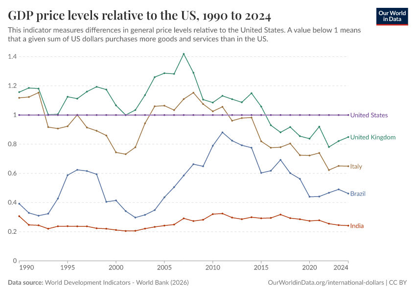 “Data Page: GDP price levels relative to the US”, part of the following publication: Max Roser, Bertha Rohenkohl, Pablo Arriagada, Joe Hasell, Hannah Ritchie, and Esteban Ortiz-Ospina (2023) - “Economic Growth”. Data adapted from World Development Indicators - World Bank. Retrieved from https://data-lexicalindex-indicators.owid.pages.dev:8789/20260202-180243/grapher/gdp-price-levels-relative-to-the-us.html [online resource] (archived on February 2, 2026).How to cite this data