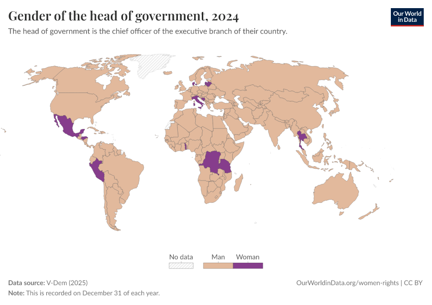 “Data Page: Gender of the head of government”, part of the following publication: Bastian Herre, Lucas Rodés-Guirao, and Esteban Ortiz-Ospina (2013) - “Democracy”. Data adapted from V-Dem. Retrieved from https://data-lexicalindex-indicators.owid.pages.dev:8789/20260119-070102/grapher/gender-of-the-head-of-government.html [online resource] (archived on January 19, 2026).How to cite this data