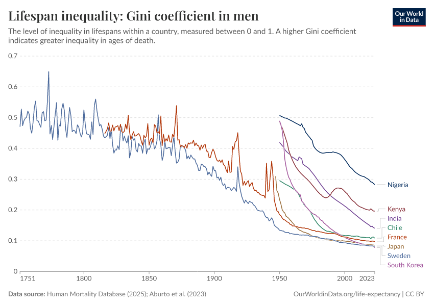 “Data Page: Lifespan inequality: Gini coefficient in men”, part of the following publication: Saloni Dattani, Lucas Rodés-Guirao, Hannah Ritchie, Esteban Ortiz-Ospina, and Max Roser (2023) - “Life Expectancy”. Data adapted from Human Mortality Database, United Nations. Retrieved from https://data-lexicalindex-indicators.owid.pages.dev:8789/20251022-222946/grapher/gini-coefficient-of-lifespan-inequality-in-males.html [online resource] (archived on October 22, 2025).How to cite this data