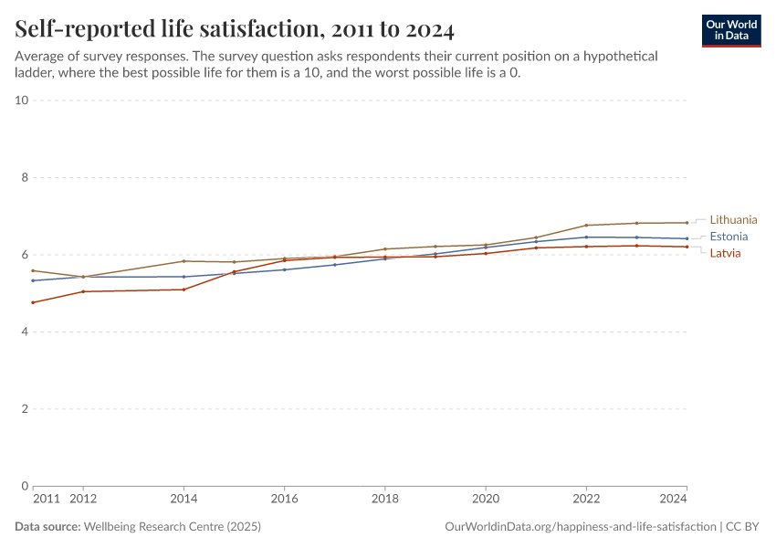 Wellbeing Research Centre (2025) – with major processing by Our World in Data. “Self-reported life satisfaction” [dataset]. Wellbeing Research Centre, “World Happiness Report 2025” [original data]. Retrieved February 9, 2026 from https://data-lexicalindex-indicators.owid.pages.dev:8789/20260119-065148/grapher/happiness-cantril-ladder.html (archived on January 19, 2026).