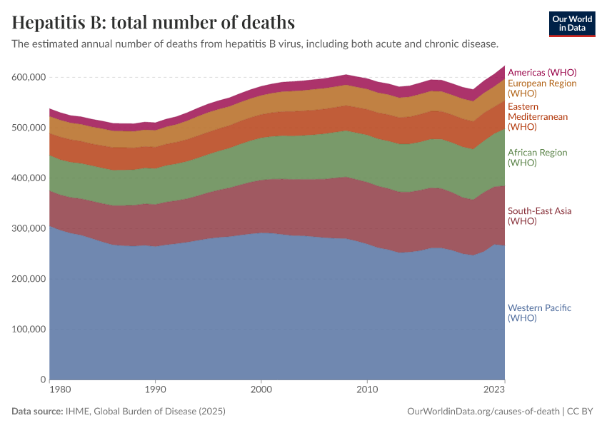 IHME, Global Burden of Disease (2024) – with minor processing by Our World in Data. “Hepatitis B: total number of deaths” [dataset]. IHME, Global Burden of Disease, “Global Burden of Disease - Deaths and DALYs” [original data]. Retrieved February 9, 2026 from https://data-lexicalindex-indicators.owid.pages.dev:8789/20250909-093708/grapher/hepatitis-b-number-of-deaths.html (archived on September 9, 2025).