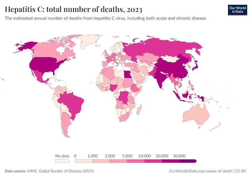 “Data Page: Hepatitis C: total number of deaths”, part of the following publication: Esteban Ortiz-Ospina and Max Roser (2016) - “Global Health”. Data adapted from IHME, Global Burden of Disease. Retrieved from https://data-lexicalindex-indicators.owid.pages.dev:8789/20250909-093708/grapher/hepatitis-c-number-of-deaths.html [online resource] (archived on September 9, 2025).How to cite this data