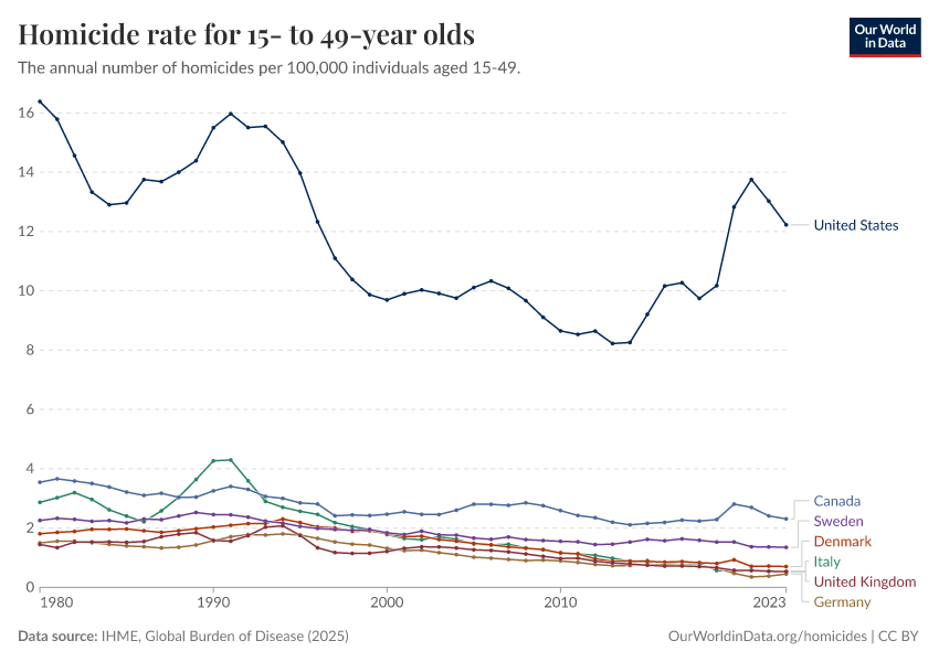 IHME, Global Burden of Disease (2024) – with minor processing by Our World in Data. “Homicide rate for 15- to 49-year olds” [dataset]. IHME, Global Burden of Disease, “Global Burden of Disease - Deaths and DALYs” [original data]. Retrieved February 9, 2026 from https://data-lexicalindex-indicators.owid.pages.dev:8789/20250909-093708/grapher/homicide-rate-in-15--to-49-year-olds.html (archived on September 9, 2025).