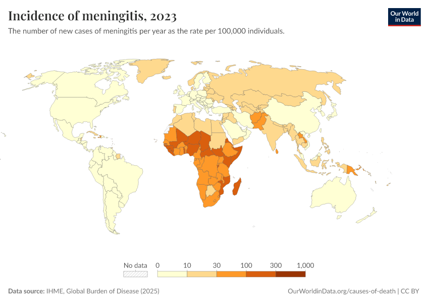 IHME, Global Burden of Disease (2024) – with major processing by Our World in Data. “Incidence of meningitis” [dataset]. IHME, Global Burden of Disease, “Global Burden of Disease - Prevalence and Incidence” [original data]. Retrieved February 9, 2026 from https://data-lexicalindex-indicators.owid.pages.dev:8789/20250909-093708/grapher/incidence-of-meningitis.html (archived on September 9, 2025).