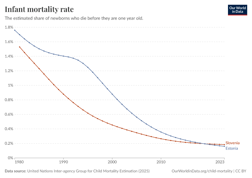 United Nations Inter-agency Group for Child Mortality Estimation (2025) – with minor processing by Our World in Data. “Infant mortality rate” [dataset]. United Nations Inter-agency Group for Child Mortality Estimation, “United Nations Inter-agency Group for Child Mortality Estimation”; Various sources, “Population” [original data]. Retrieved February 9, 2026 from https://data-lexicalindex-indicators.owid.pages.dev:8789/20260119-070102/grapher/infant-mortality.html (archived on January 19, 2026).
