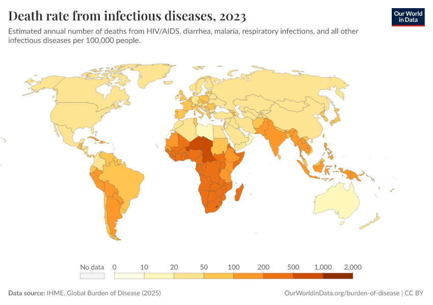 IHME, Global Burden of Disease (2024) – with minor processing by Our World in Data. “Death rate from infectious diseases” [dataset]. IHME, Global Burden of Disease, “Global Burden of Disease - Deaths and DALYs” [original data]. Retrieved February 9, 2026 from https://data-lexicalindex-indicators.owid.pages.dev:8789/20250909-093708/grapher/infectious-disease-death-rates-gbd.html (archived on September 9, 2025).