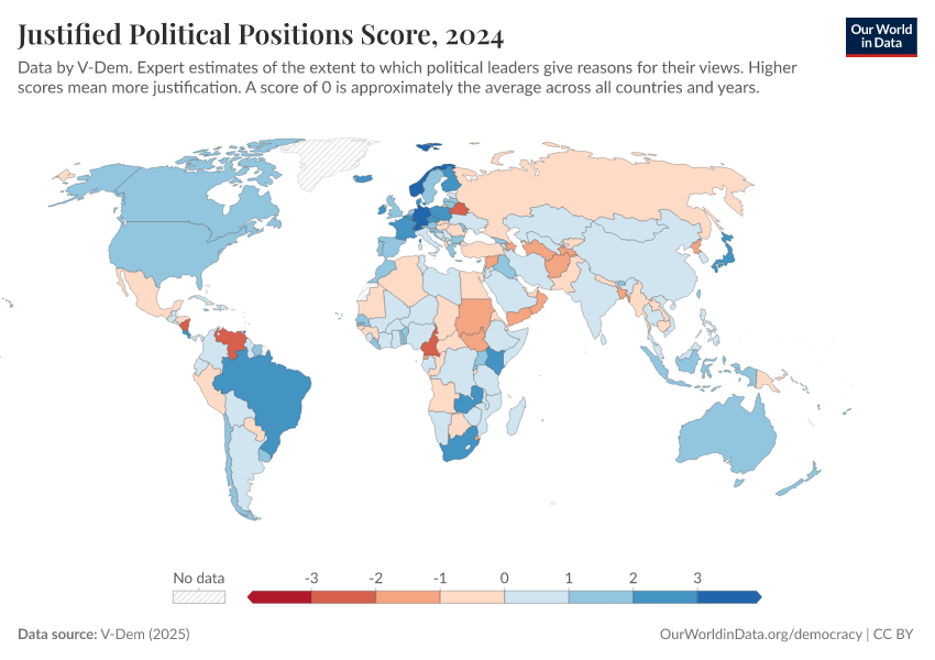 “Data Page: Justified political positions”, part of the following publication: Bastian Herre, Lucas Rodés-Guirao, and Esteban Ortiz-Ospina (2013) - “Democracy”. Data adapted from V-Dem. Retrieved from https://data-lexicalindex-indicators.owid.pages.dev:8789/20260204-170225/grapher/justified-political-positions-score.html [online resource] (archived on February 4, 2026).How to cite this data