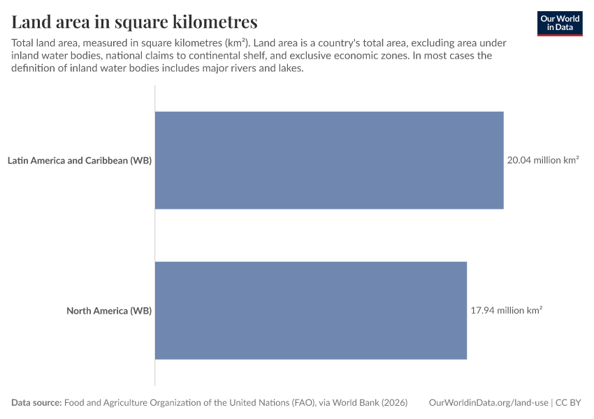 Food and Agriculture Organization of the United Nations (FAO), via World Bank (2026) – processed by Our World in Data. “Land area in square kilometres” [dataset]. Food and Agriculture Organization of the United Nations (FAO), via World Bank, “World Development Indicators 125” [original data]. Retrieved February 9, 2026 from https://data-lexicalindex-indicators.owid.pages.dev:8789/20260202-181317/grapher/land-area-km.html (archived on February 2, 2026).