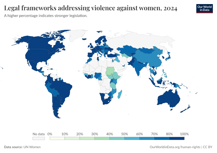 “Data Page: Legal frameworks addressing violence against women”. Our World in Data (2026). Data adapted from UN Women. Retrieved from https://data-lexicalindex-indicators.owid.pages.dev:8789/20260130-180113/grapher/legal-frameworks-regarding-violence-against-women.html [online resource] (archived on January 30, 2026).How to cite this data