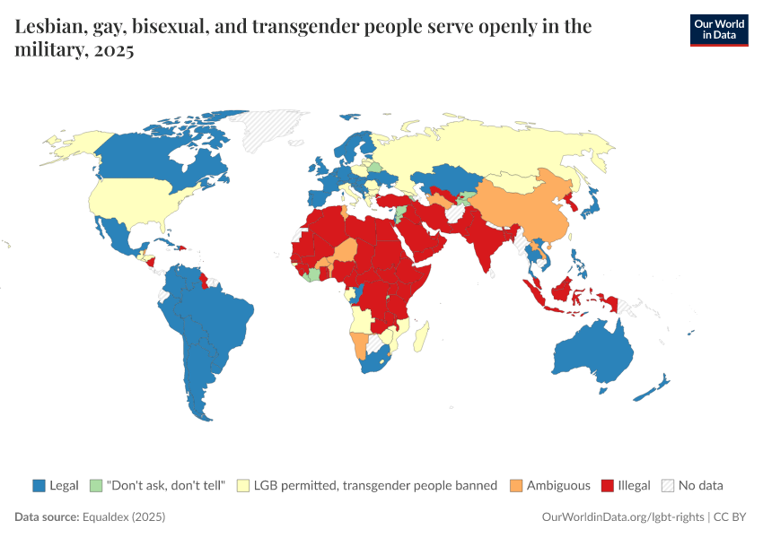 “Data Page: Lesbian, gay, bisexual, and transgender people serve openly in the military”, part of the following publication: Bastian Herre and Pablo Arriagada (2023) - “LGBT+ Rights”. Data adapted from Equaldex. Retrieved from https://data-lexicalindex-indicators.owid.pages.dev:8789/20250909-093708/grapher/lgbt-military-equaldex.html [online resource] (archived on September 9, 2025).How to cite this data