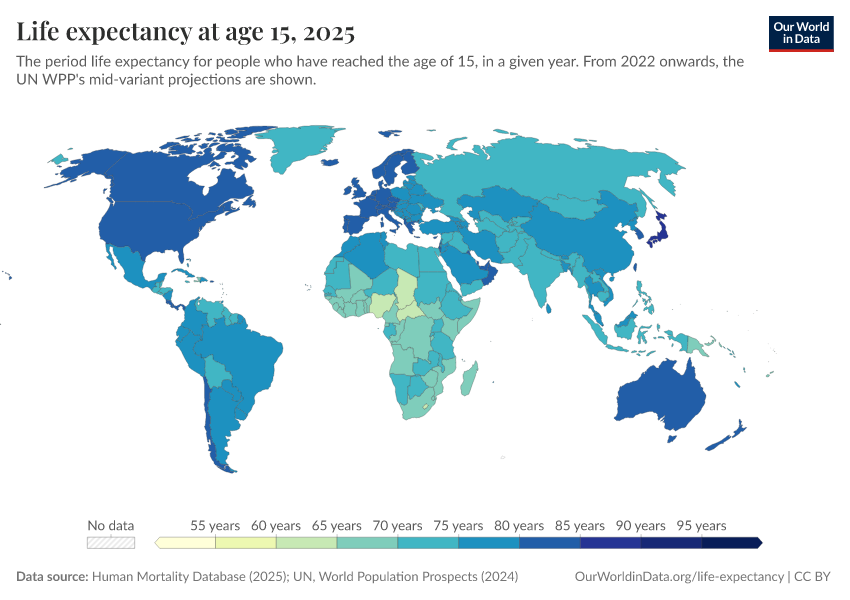 “Data Page: Life expectancy at 15”, part of the following publication: Saloni Dattani, Lucas Rodés-Guirao, Hannah Ritchie, Esteban Ortiz-Ospina, and Max Roser (2023) - “Life Expectancy”. Data adapted from Human Mortality Database, United Nations. Retrieved from https://data-lexicalindex-indicators.owid.pages.dev:8789/20251022-222946/grapher/life-expectancy-at-age-15.html [online resource] (archived on October 22, 2025).How to cite this data