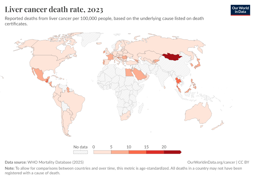 WHO Mortality Database (2025) – with minor processing by Our World in Data. “Liver cancer death rate” [dataset]. WHO Mortality Database, “WHO Mortality Database” [original data]. Retrieved February 9, 2026 from https://data-lexicalindex-indicators.owid.pages.dev:8789/20250909-093708/grapher/liver-cancer-death-rate.html (archived on September 9, 2025).