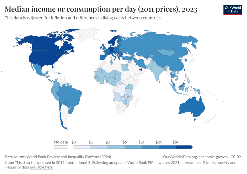 World Bank Poverty and Inequality Platform (2024) – with major processing by Our World in Data. “Median income or consumption per day (2011 prices) – World Bank” [dataset]. World Bank Poverty and Inequality Platform, “World Bank Poverty and Inequality Platform (PIP) 20240627_2017, 20240627_2011” [original data]. Retrieved February 9, 2026 from https://data-lexicalindex-indicators.owid.pages.dev:8789/20251022-091218/grapher/median-income-or-consumption-per-day-2011-prices.html (archived on October 22, 2025).