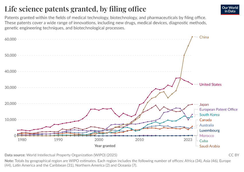 “Data Page: Life science patents granted, by filing office”. Our World in Data (2026). Data adapted from World Intellectual Property Organization (WIPO). Retrieved from https://data-lexicalindex-indicators.owid.pages.dev:8789/20251031-120222/grapher/medicine-and-biotechnology-patents-granted-by-filing-office.html [online resource] (archived on October 31, 2025).How to cite this data