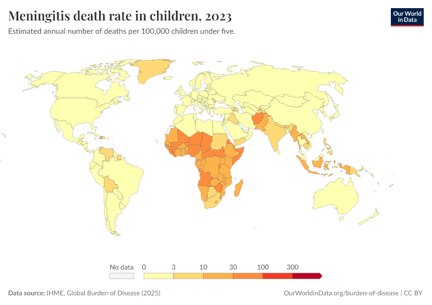 IHME, Global Burden of Disease (2024) – with minor processing by Our World in Data. “Meningitis death rate in children” [dataset]. IHME, Global Burden of Disease, “Global Burden of Disease - Deaths and DALYs” [original data]. Retrieved February 9, 2026 from https://data-lexicalindex-indicators.owid.pages.dev:8789/20250909-093708/grapher/meningitis-death-rates-children-under-5.html (archived on September 9, 2025).