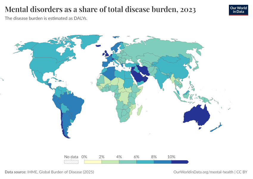 IHME, Global Burden of Disease (2024) – with minor processing by Our World in Data. “Mental disorders as a share of total disease burden” [dataset]. IHME, Global Burden of Disease, “Global Burden of Disease - Deaths and DALYs” [original data]. Retrieved February 9, 2026 from https://data-lexicalindex-indicators.owid.pages.dev:8789/20250909-093708/grapher/mental-and-substance-use-as-share-of-disease.html (archived on September 9, 2025).