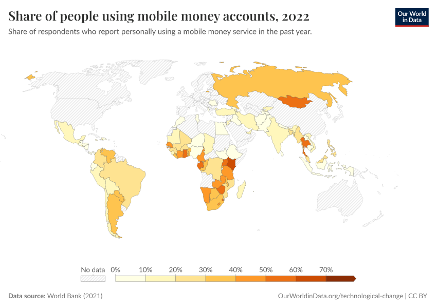 “Data Page: Share of people using mobile money accounts”, part of the following publication: Max Roser, Bertha Rohenkohl, Pablo Arriagada, Joe Hasell, Hannah Ritchie, and Esteban Ortiz-Ospina (2023) - “Economic Growth”. Data adapted from World Bank. Retrieved from https://data-lexicalindex-indicators.owid.pages.dev:8789/20250909-093708/grapher/mobile-money-account-usage.html [online resource] (archived on September 9, 2025).How to cite this data
