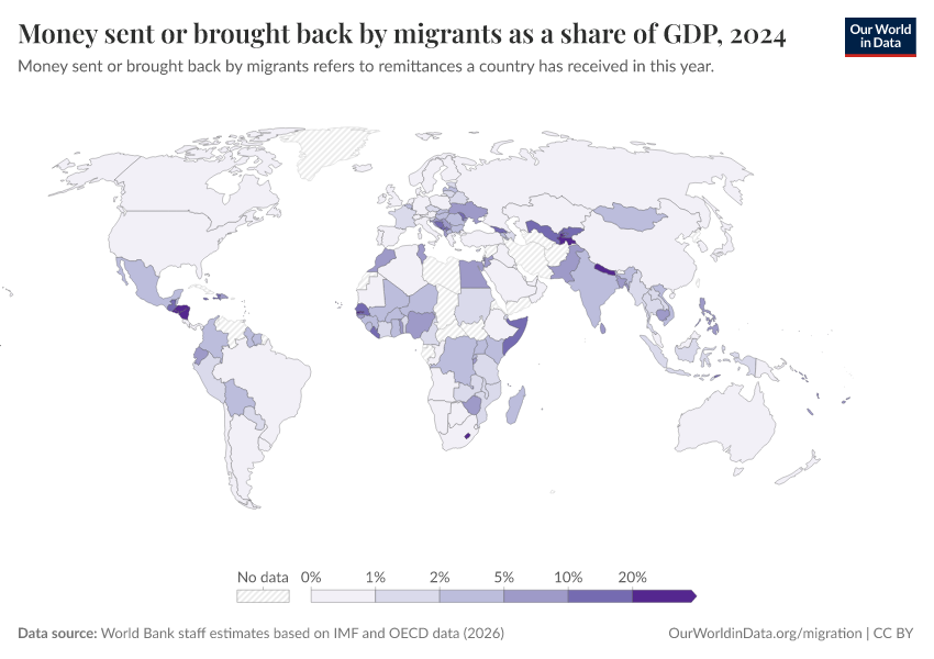“Data Page: Money sent or brought back by migrants as a share of GDP”. Our World in Data (2026). Data adapted from World Bank staff estimates based on IMF and OECD data. Retrieved from https://data-lexicalindex-indicators.owid.pages.dev:8789/20260202-181317/grapher/money-sent-or-brought-back-by-migrants-as-a-share-of-gdp.html [online resource] (archived on February 2, 2026).How to cite this data