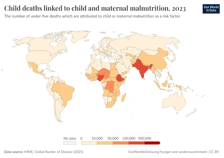 IHME, Global Burden of Disease (2024) – with minor processing by Our World in Data. “Child deaths linked to child and maternal malnutrition” [dataset]. IHME, Global Burden of Disease, “Global Burden of Disease - Risk Factors” [original data]. Retrieved February 9, 2026 from https://data-lexicalindex-indicators.owid.pages.dev:8789/20250909-093708/grapher/number-child-deaths-malnutrition.html (archived on September 9, 2025).
