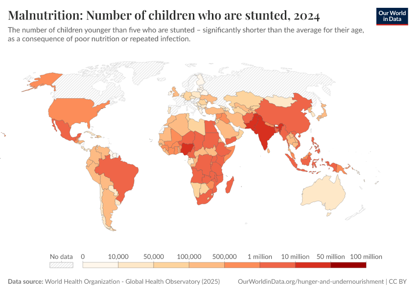 “Data Page: Malnutrition: Number of children who are stunted”. Our World in Data (2026). Data adapted from World Health Organization. Retrieved from https://data-lexicalindex-indicators.owid.pages.dev:8789/20260119-070102/grapher/number-children-stunted-who.html [online resource] (archived on January 19, 2026).How to cite this data